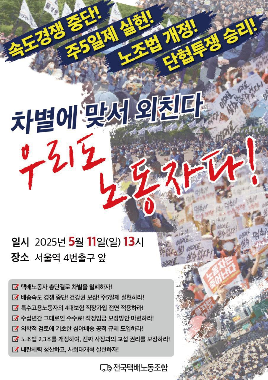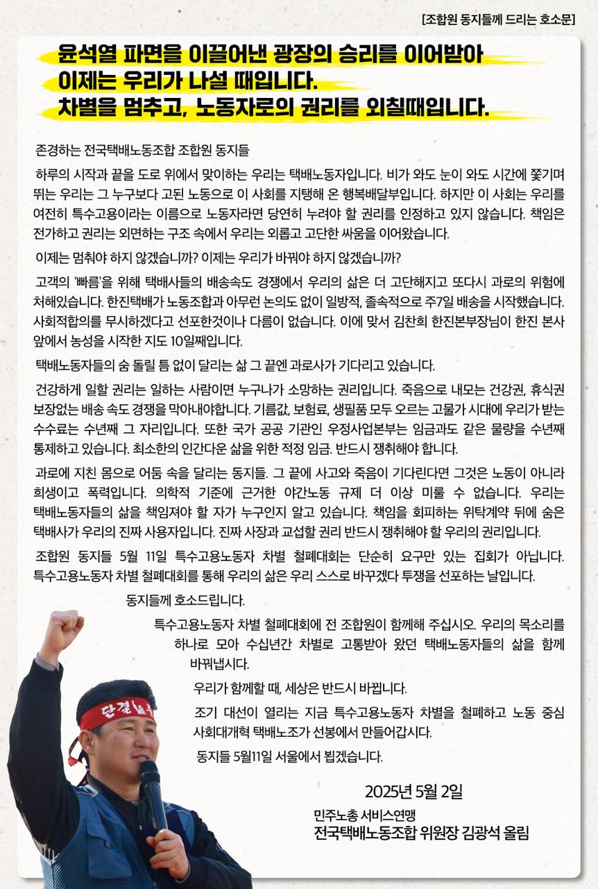 조기 대선이 열리는 지금 특수고용노동자 차별을 철폐하고 노동 중심 사회대개혁 택배노조가 선봉에서 만들어갑시다.