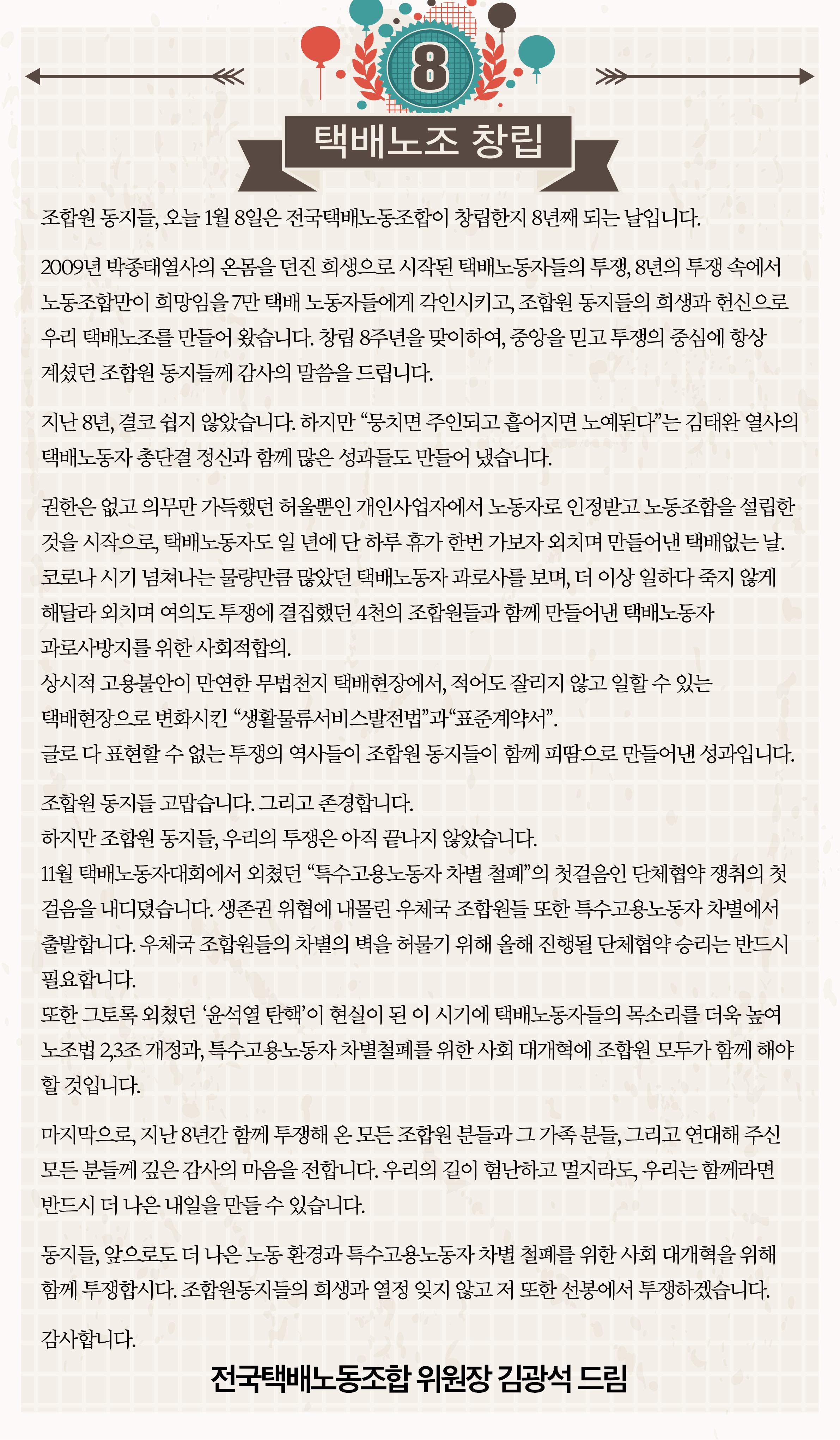 2009년 박종태열사의 온몸을 던진 희생으로 시작된 택배노동자들의 투쟁, 8년의 투쟁 속에서 노동조합만이 희망임을 7만 택배 노동자들에게 각인시키고, 조합원 동지들의 희생과 헌신으로 우리 택배노조를 만들어 왔습니다. 창립 8주년을 맞이하여, 중앙을 믿고 투쟁의 중심에 항상 계셨던 조합원 동지들께 감사의 말씀을 드립니다.