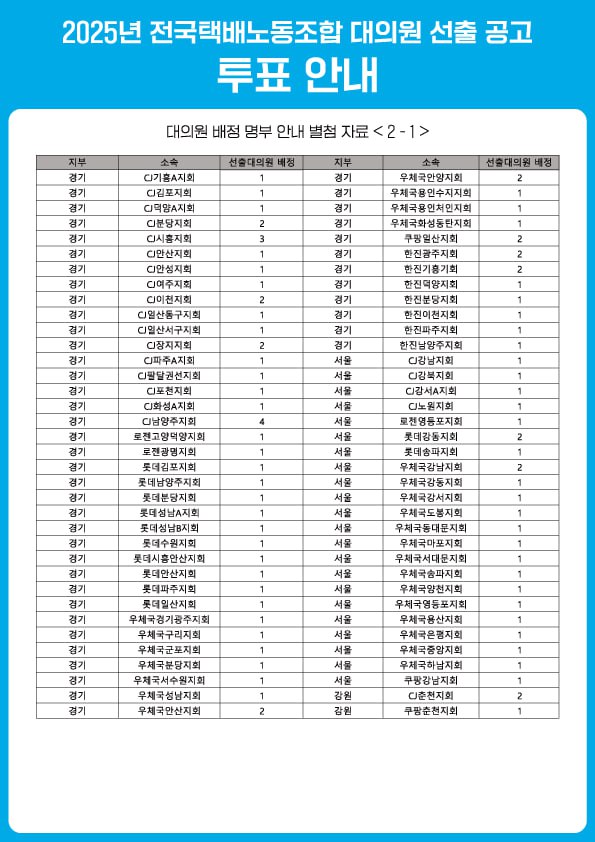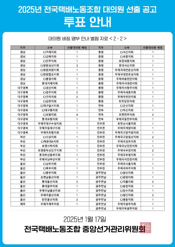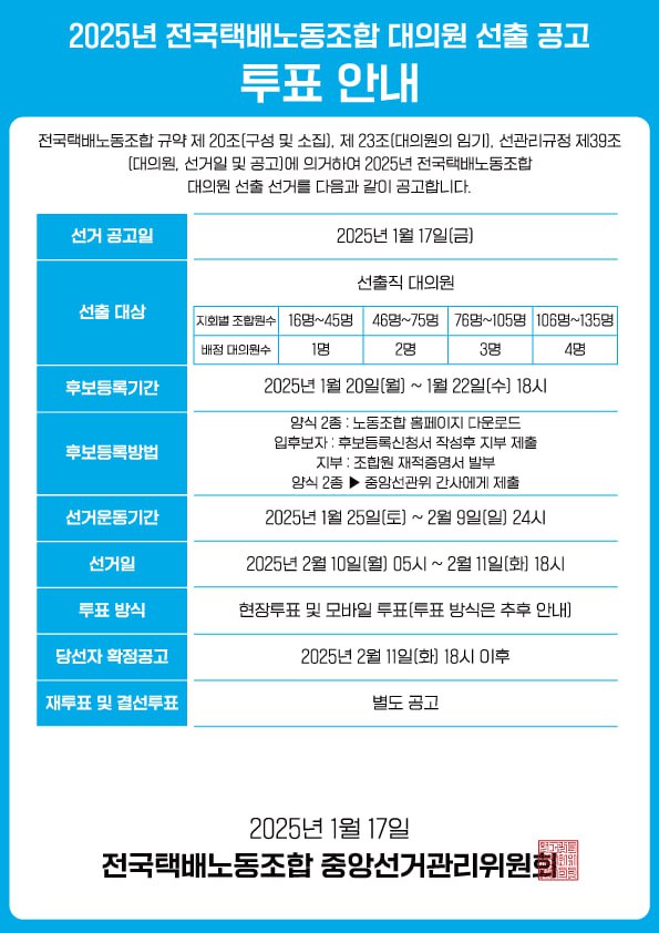 전국택배노동조합 규약 제 20조(구성 및 소집), 제 23조(대의원의 임기), 선거관리규정 제 39조(대의원, 선거일 및 공고)에 의거하여 2025년 전국택배노동조합 대의원 선출 선거를 다음과 같이 공고합니다.